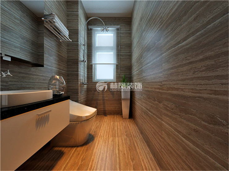 碧桂园凤凰城130平三室两厅北欧风格林凤装饰的卫生间的户型因为是长条形,所以在瓷砖的选择上 采用了有拉伸效果的条形纹理的瓷砖,合理的划分了每个位置的使用空间。