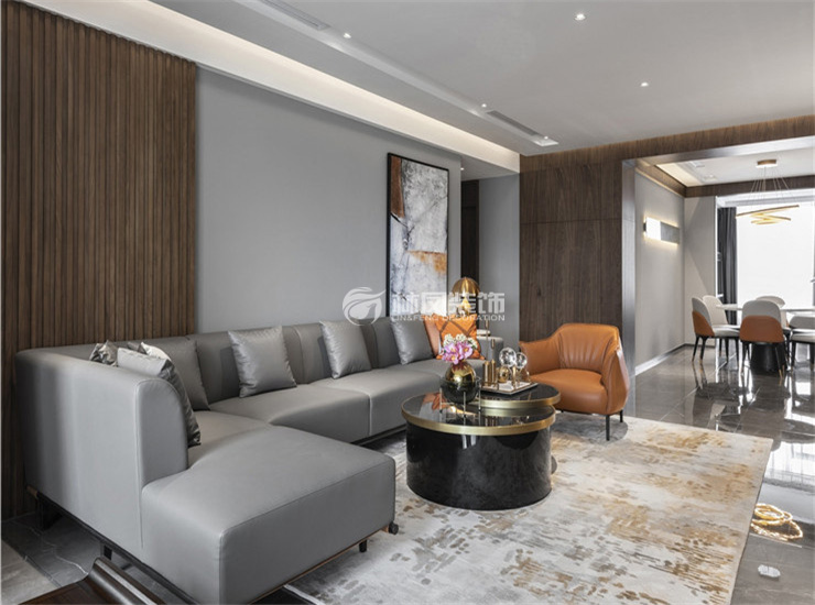 金地檀府180平四室两厅现代风格林凤装饰的客厅以灰色的沙发增加了跳色的点缀,略显高档,看起来明亮简洁,简约又舒适,打开一盏灯,光晕和冷峻的空间撞出一种宁静的力量。在简洁中寻找其暗藏的美感,增强了内部层次感,简洁而不简单的变化,充分的体现出了“简单,温馨,实在”的风格。