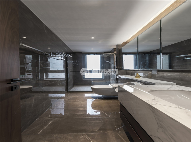金地檀府180平四室两厅现代风格林凤装饰的卫生间整体以白色为主,理石纹理的台面,自由奔放,自然的环境使得空间中的人感到舒适,简约的风格中提高人们的品味。简约,温馨。