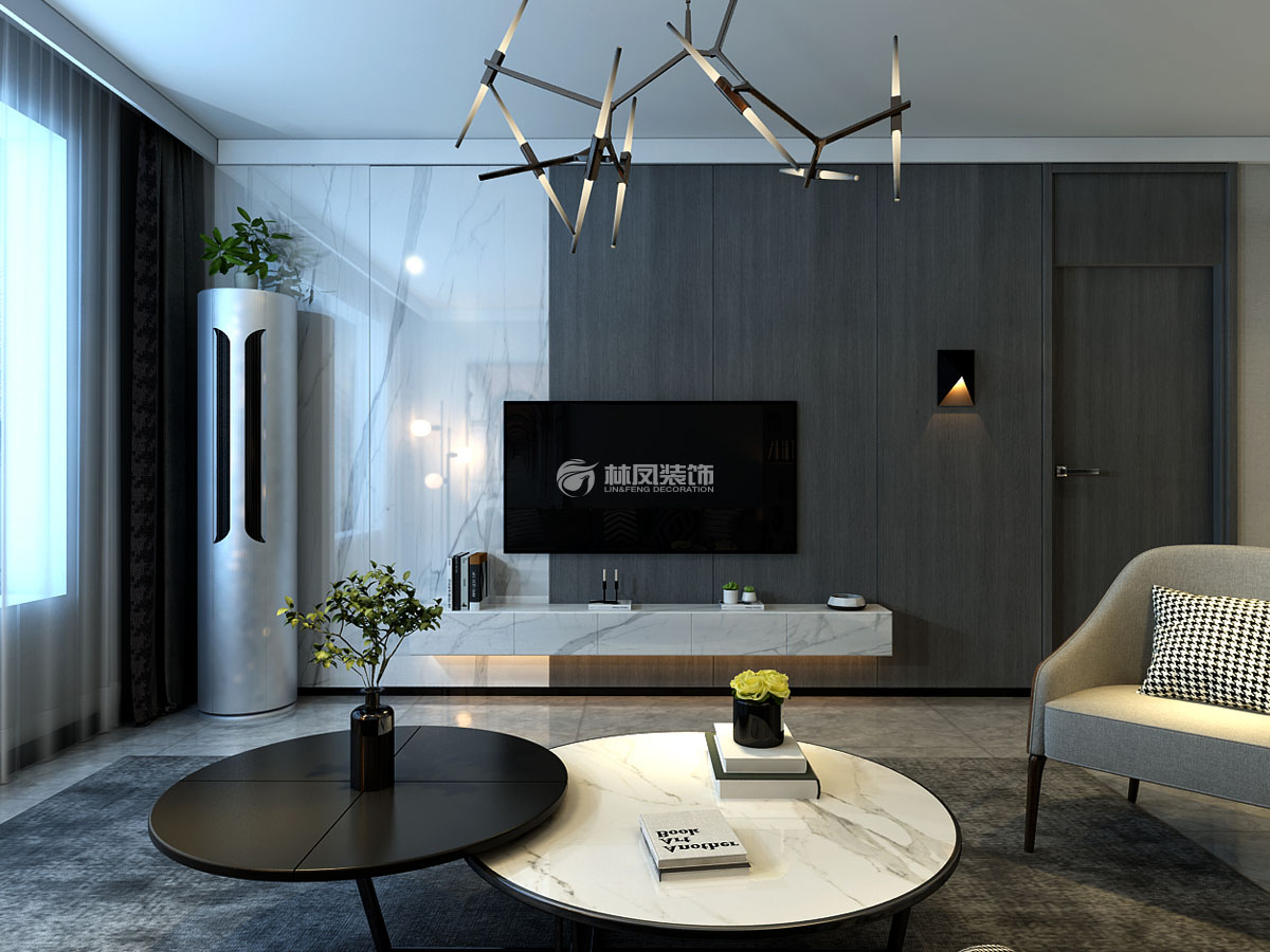 保利茉莉公馆122平三居室现代风格林凤装饰的客厅比较抢眼的是背景墙质感以理石于护墙板为主做的隐藏门效果,与背景墙45°对着的是儿童卧室,卧室门为了配合背景墙也同样做的通体色块。