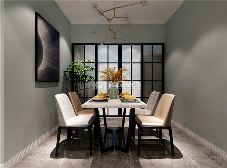 玖城乐府158m²5居室现代风格林凤装饰的餐桌的材质上也考虑了整体性,餐桌的台面也采用了爵士白理石。餐腿部分用了黑色木质,墙面搭配了雾霾蓝的调色乳胶漆。