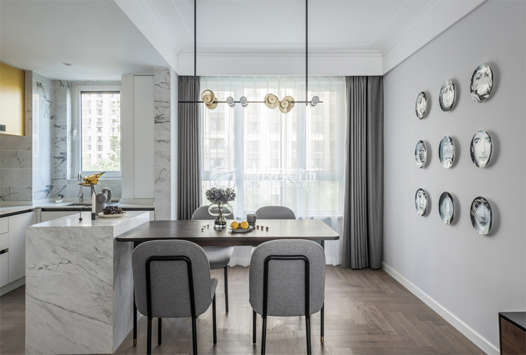 保利香槟84㎡现代风格两室两厅林凤装饰的餐厅与厨房相连接,整体家居选择了灰色系,浅灰色的配色不会让整体空间过于沉闷,反而充满着时尚气息,使得此户型餐厅区域更加协调、完整,让户主无论是在视觉上还是触觉上都能有着放松舒适的感受。