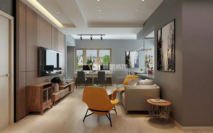 乐天圣苑122平三室两厅现代极简风格林凤装饰的客厅家具上选择了灰色的布艺沙发,搭配靠枕黄橘色的配饰作为点缀,木质的茶几,背景墙采用了木质木板色,配上现代木色的电视柜,显得简单大方。