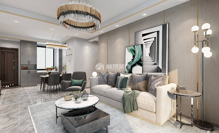 中海城尚城135平三室两厅林凤装饰的客厅以现代轻奢风格为主,家具材质采用布艺感觉,舒适度非常高,灰色的地面,与电视墙面的理石进行呼应,棚面的线条增加时尚感,让原本简单的吊棚,增加时尚气息。