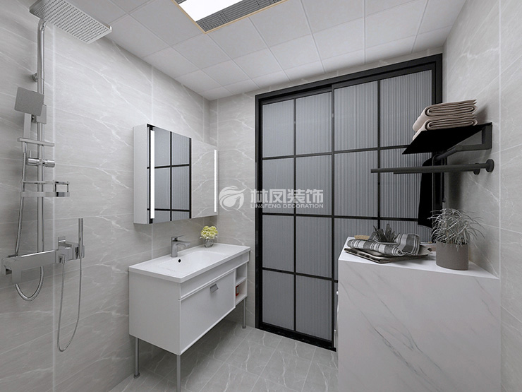 城建万科翡翠书院95平两室两厅林凤装饰的卫生间灰色的历史纹理瓷砖,搭配上白色的浴室柜体让整体空间很干净。