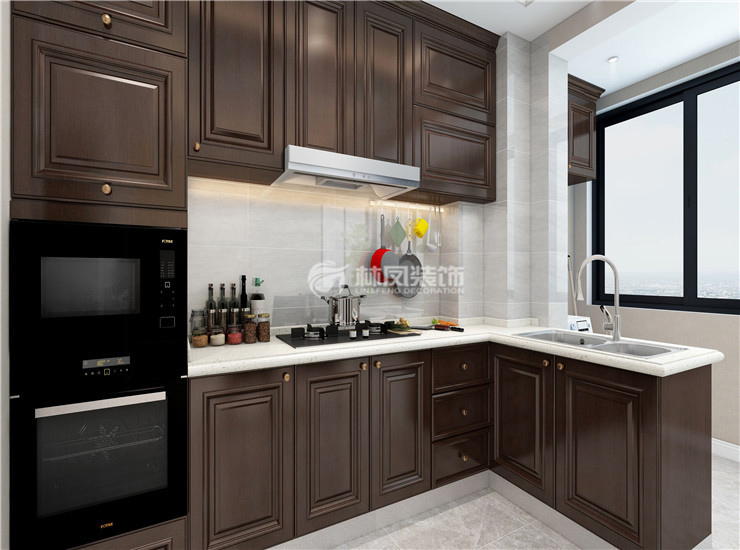 君安阳光城142平三室两厅平层现代美式风格林凤装饰的厨房台面采用的是石英石单色台面,简单易打理,在搭配深色橱柜使整个空间更具有现代的的知性雅致主义的生活品味。