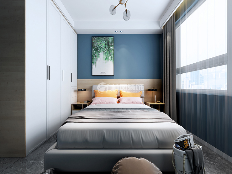凯兴花园160平三室两厅北欧风格林凤装饰的卧室以原木色为主的衣柜,本着卧室作为主人休息的空间,仅用单纯的,纯色壁纸,作为床头背景,简约而不失空间设计