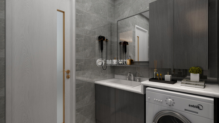 卫生间墙砖采用了波斯灰大理石纹,洗手台做了内嵌洗衣机设计,美观的同时增加了功能性,增加了镜箱柜,增加的必备的收纳空间。融创中央学府132平三室两厅现代轻奢风格林凤装饰的
