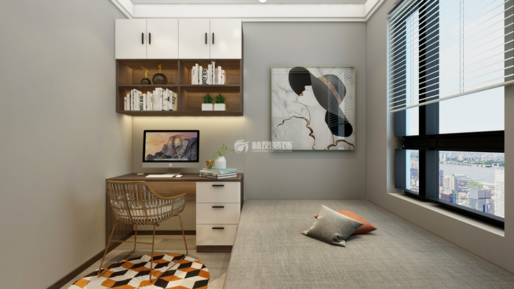 绿地海域香庭99平三室两厅现代风格林凤装饰的主卧柜门用的白色,搭配灰色地板,温馨明亮,窗帘37拼接,橘色呼应床品,时尚简洁
