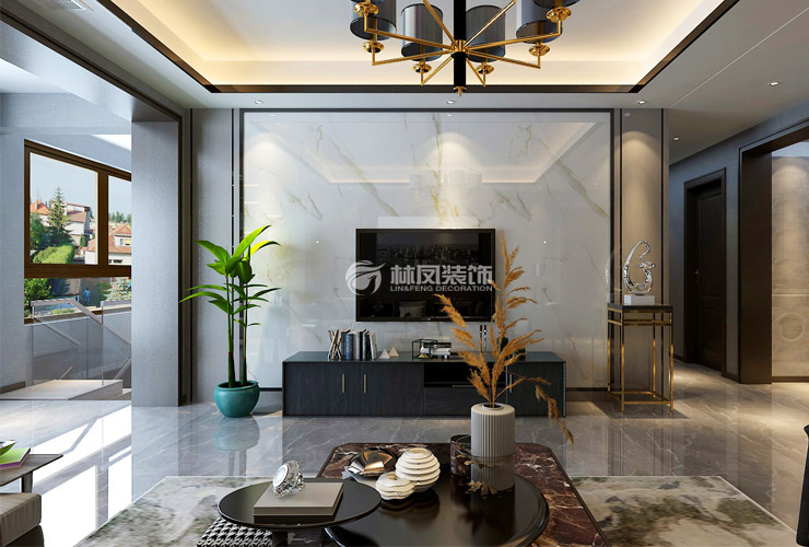 荣盛锦绣观邸172平四室两厅轻奢风格林凤装饰的客厅部分主要是以会客为主,选择灰色地砖,搭配雅士白理石背景墙结合木质护墙板,客厅预留出中央空调,整体色调为灰色,沙发背景墙通过硬包及挂画来装饰。