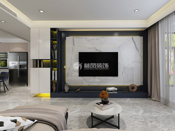 保利达江湾城110平现代风格三室两厅林凤装饰的客厅整体色系以灰色调为主,搭配黑色,白色,木色,米色的材质让整体色系都属于中性色内,柔和舒适,石材的背景墙让整体空间简单奢华。