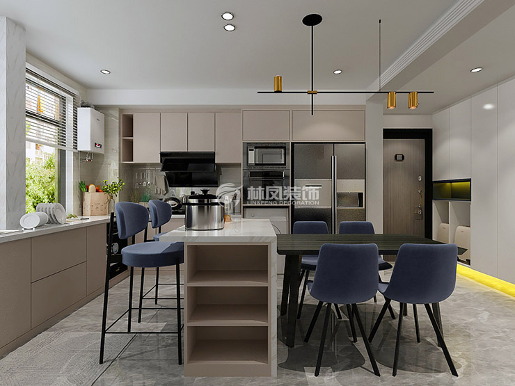 保利达江湾城110平现代风格三室两厅林凤装饰的餐厅空间在厨房中心,连接岛台实用美观,让人一进入房间就可以感受到宽敞高级的感觉。
