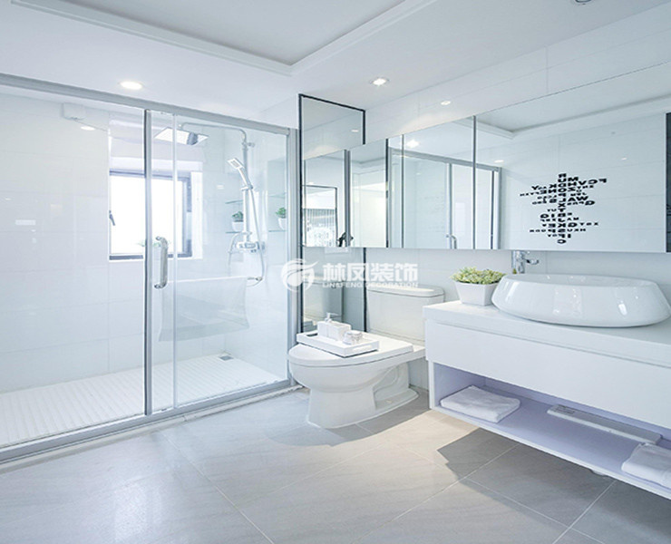 美好奉玺台108平三室两厅现代轻奢风格林凤装饰的卫生间没有改动,手盆马桶淋浴正常设计摆放,洗衣机放置在厨房。
