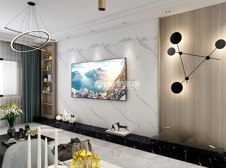首创光合城107平三室两厅现代风格林凤装饰的客厅整体墙面以明亮的白色为主,电视墙石材加护墙板更上档次。沙发墙搭配灰色,是整个空间更有质感。