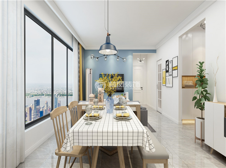 旭辉东樾城103平三室两厅北欧风格林凤装饰的客厅与餐厅区域在同一空间,不算太大,但需要选择体量不要太大的家具,北欧风格的家具非常适合,通过天蓝色的壁纸将电视背景体现出来,干净,大气,增大空间。