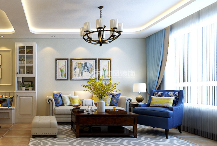 本案户型客厅主要作用是满足客户生活起居,家具上选择了布艺的沙发,深木色实木的茶几、角几,装修上采用了弧形造型加上彩色壁纸与石膏线搭配的背景墙设计,主要目的就是把美式风格的一些特点体现出来。