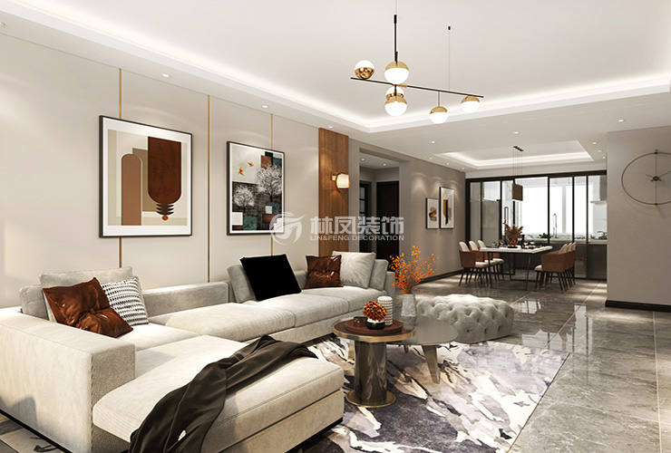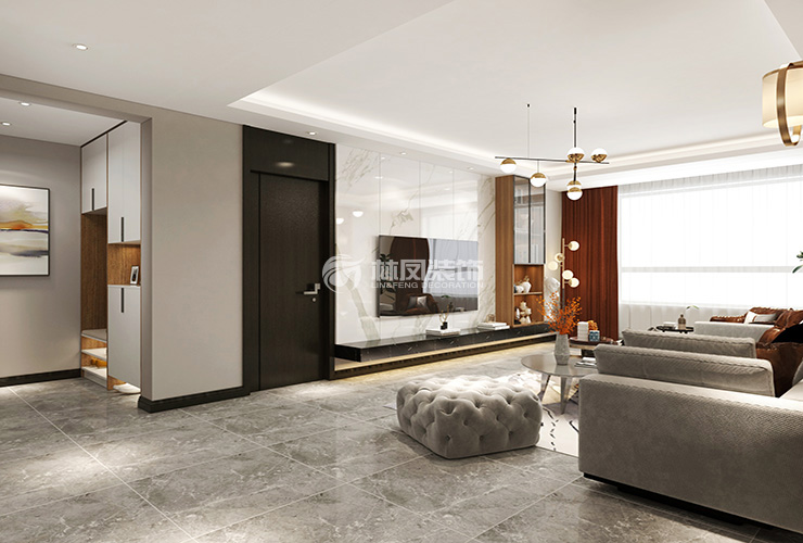 融创沈阳府145平四室两厅现代风格林凤装饰的客厅的空间吊顶造型非常丰富,电视背景墙造型一侧采用隐形门口设计,另一侧是假门板,中间以石材和护墙板的结合,电视柜组合形式为主,沙发墙后期按照风格的要求放置一组装饰画。装饰画为衬托,使居室充满惬意、轻松气氛。