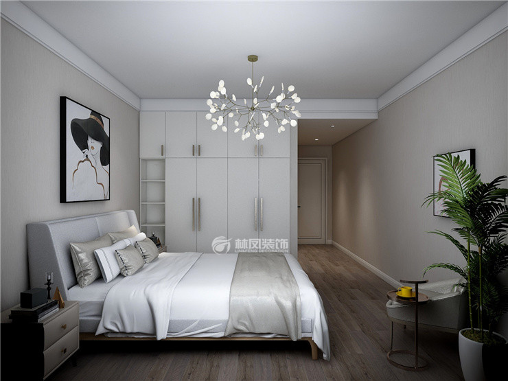 远洋大河宸章155平三室两厅现代港式风格林凤装饰的卧室运用白色作为主色调,整体风格也是简洁的,让卧室变得十分温馨,无论是墙面地面家具等,都是以简洁为主,室内的绿植增添了生气,可以让业主拥有一个舒适的休息空间。