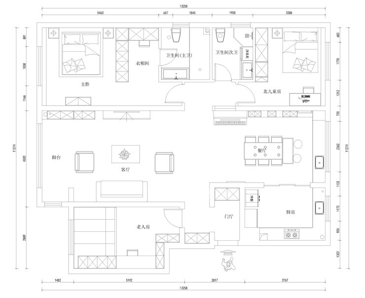 三室两厅一厨两卫,高层整体采用美式风格,色调以深色为主,体现美式的居家感和温馨感。