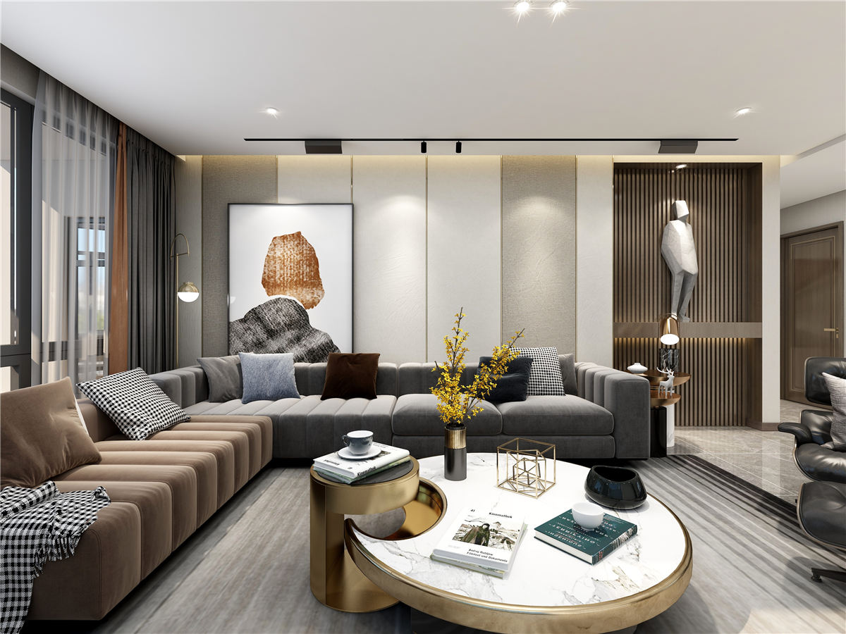 南湖公园150平三室两厅港式风格林凤装饰的客厅的布局采用“L”型沙发加一个单椅的设计,整体色调以深色调为主,窗帘采用当下比较流行的拼接式设计。沙发背景墙门口正对着的一侧采用嵌入墙体式的景观设计。客厅的吊顶采用的是磁吸轨道灯和无主灯的设计,使整个空间看起来更有质感更大气。