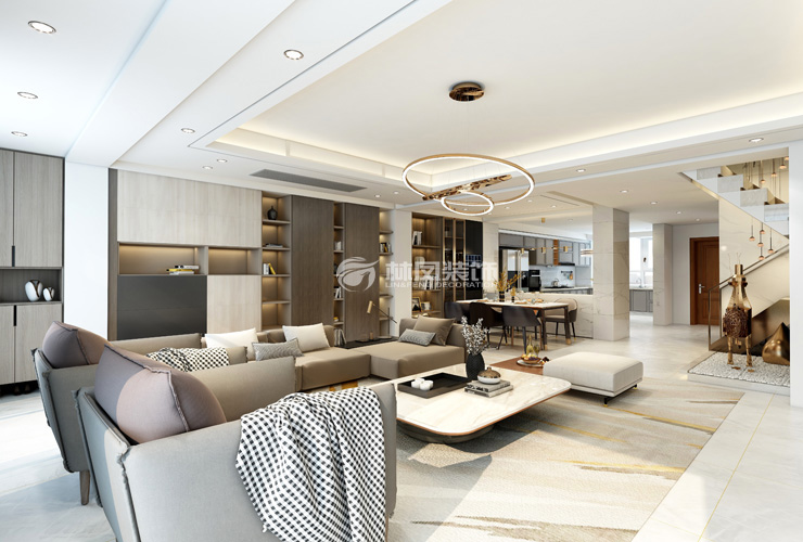 孔雀城220平三室两厅现代风格林凤装饰的客厅中的整体感觉以大气为主调,客厅作为家里的中心位置,在元素质感还有色调上都比较明亮。