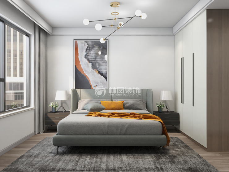 【主卧室说明】顶部不做吊顶,用线条装饰,干净利落,暖灰亚光的地板很符合空 间的属性;【次卧室说明】次卧于主卧一脉相承,色调以白色为主,搭配暖灰的木色。