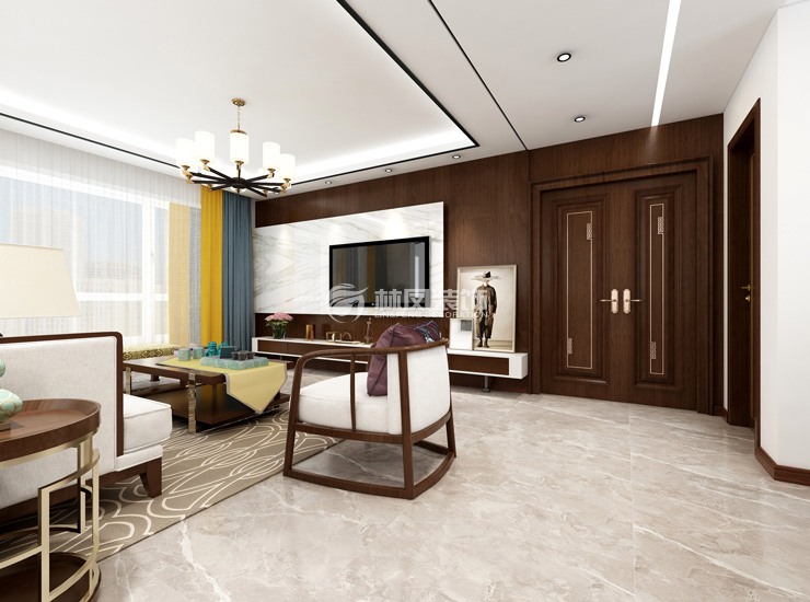 碧桂园御长白150平四室两厅新中式风格林凤装饰的客厅摒弃复杂的顶面设计,运用简洁的现代感角线作为顶立面的交接,很好的分割空间,配合简约中式家具轻松勾勒出中式画面的空间。