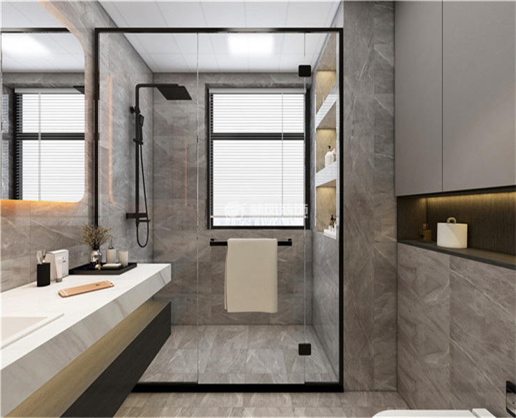 碧桂园名门170平三室两厅现代港式风格林凤装饰的卫生间的墙砖采用地砖上墙的形式,使整个装饰效果更大气。马桶为壁挂式马桶,使空间看起来更干净,并且没有死角,易清理。