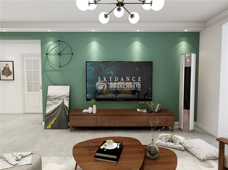 国奥现代城93平两室两厅北欧风格林凤装饰的客厅电视墙采用了墨绿色的墙布,搭配整体深木色家具,简单线条的吊棚,打造简单 温馨 温馨的室内空间。