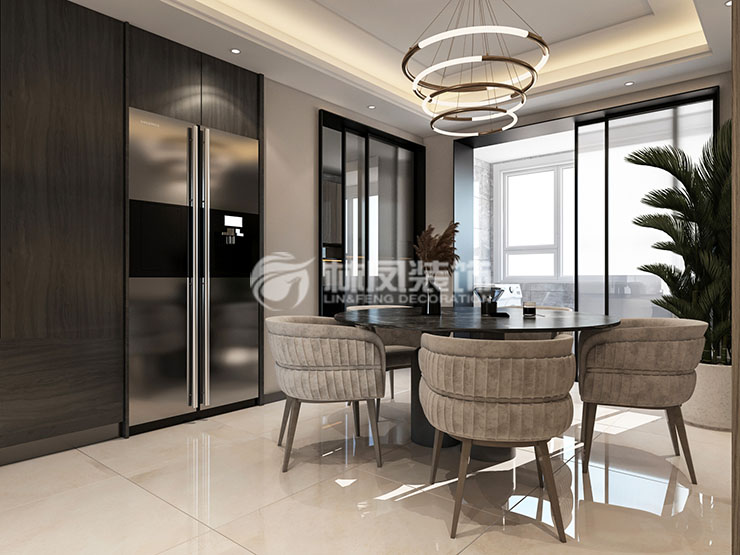 恒大华府180平4居室现代轻奢风格林凤装饰的餐厅业主希望摆置一张圆桌,象征合家团圆的美好愿景,在添置圆桌的基础上使用圆形吊灯与之相呼应,棚顶地面相辅相成;在厨房外合理运用定制做出暗藏冰箱的柜面设计,充分利用空间的同时又巧妙避免了冰箱露出侧面的尴尬。