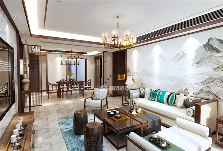 越秀星汇云锦168平三室两厅新中式风格林凤装饰的客厅沙发背景墙采用壁布似山水画的设计外加大理石背景墙,从而体现出一种低调的新中式,阳台部分做成茶室,下面是榻榻米的暗格,同时增添了收纳空间,榻榻米上方做成展示柜,凸显出新中式的气息。