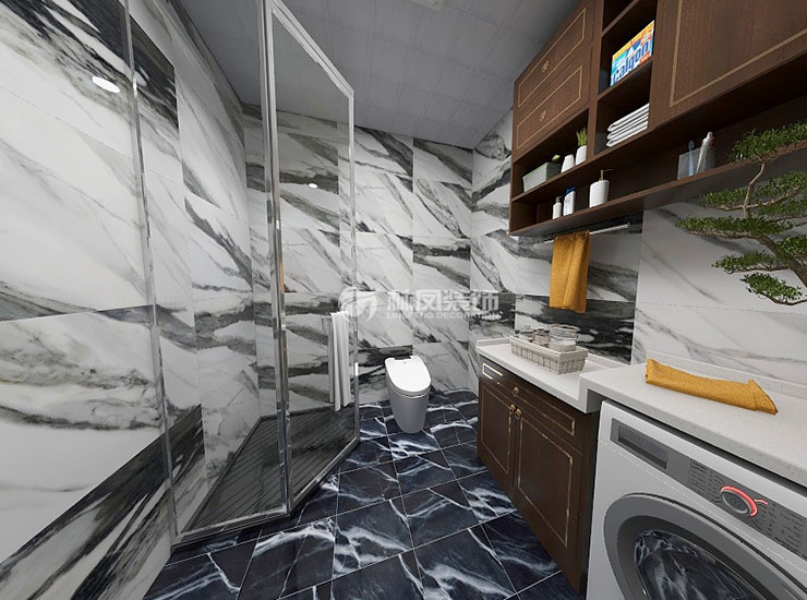 融通家园150平三室两厅新中式风格林凤装饰的卫生间的设计上,采用了比较个性的黑色地砖复合主人女儿的性格,开朗却不失优雅,雅士白的瓷砖上有黑色的自然裂纹的纹理,张扬不失优雅。