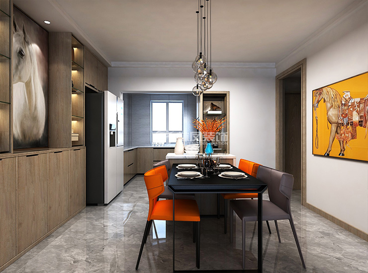 保利香槟国际134平三室两厅现代风格林凤装饰的餐厅和和客厅相连,体现了整体大气,外加岛台,现代气息更强。厨房做开放式厨房,加大整体空间感。橱柜跟酒柜呼应,更加体现出整体之感。