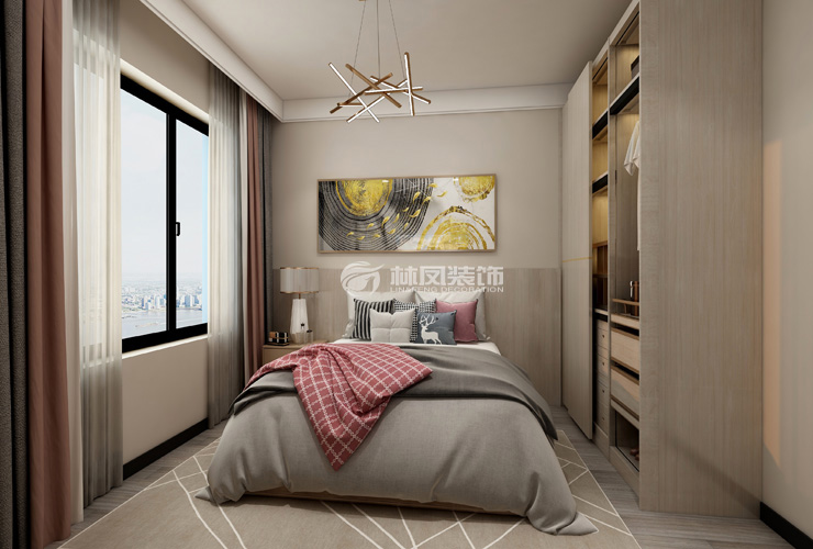 浦江御景湾120平三室两厅现代风格林凤装饰的主卧的色调相对较暖有利于休息和睡眠,书柜能满足睡前阅读的生活习惯,整体的墙板让空间稍大的卧室更温暖有包围感