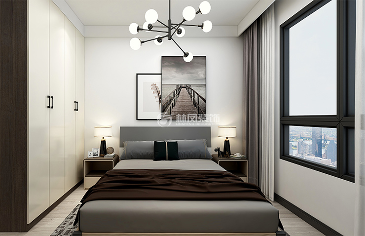 绿城全运村玉兰花园128平三室两厅现代简约风格林凤装饰的主卧为套间,带有独立的卫生间,门后设置衣柜,睡眠区独立出来,营造静谧的空间感受。