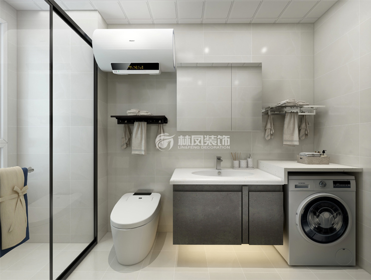 绿城全运村玉兰花园128平三室两厅现代简约风格林凤装饰的主卫瓷砖为上下版,增加层次感。跳色的浴室柜打破固有的灰色体系。坐便右侧的空间比较狭小,选用浴帘代替浴屏,节省了空间。