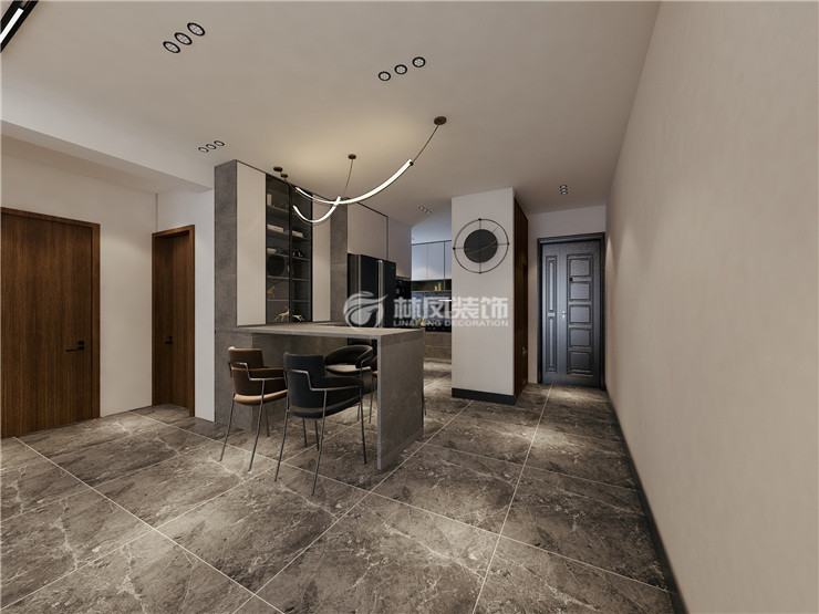 餐厅与厨房选用敞开式,极简的吧台造型,皮质餐椅,衬托着不凡的品味。暖色光的衬托,色香味俱全的饭菜在这样的环境中自有一番风味。