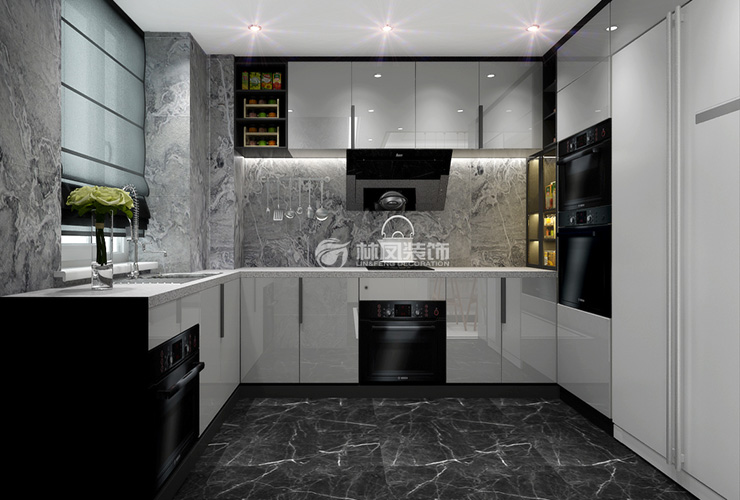 厨房墙面采用高光白的柜面 加上黑色蒸箱烤箱等电器和深色瓷砖 达到设计上的上浅下深 层次分明 干净整洁