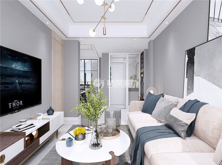 吊棚上增加了金属线条的装饰。让简约的吊棚不过于简单。背景墙以墙板和乳胶漆结合大气时尚。整体空间都以黑白灰为主。无需复杂化就让空间显得无比通透。
