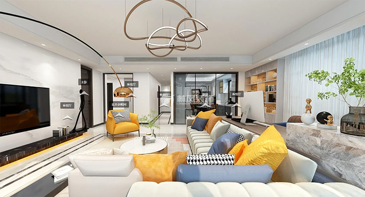 客厅空间很大有一整面的大窗户,看着十分开阔,为了让空间不浪费,在沙发后放了办公桌,打了一趟柜子,这样既有客厅空间,也有书房空间合理的利用了空间,也让客厅不那么空旷,并且客厅采用了明亮的颜色,让人心情也开放。