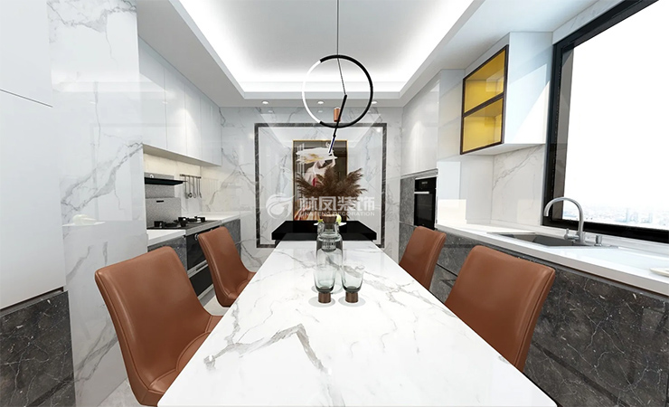 餐厅做在了厨房里面,理石桌子连接岛台,既时尚又实用还很好打理,黑色的岛台与白色餐桌进行搭配。