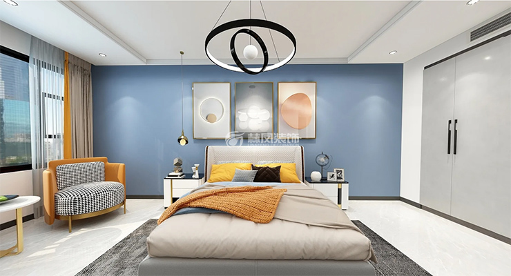 主卧室空间也很大直接在一面墙做了一趟的衣柜增加储物空间,背景墙做了蓝色搭配拼色的米橙色窗帘,靠窗放了休闲座椅,可以做休闲的地方看看书晒晒太阳整个卧室没有太多繁琐的东西,也不缺任何功能。次卧并没有太多的装饰也没有做大衣柜,只是供客人休息的地方,但也做了一个斗柜,有一个小的储物收纳空间。