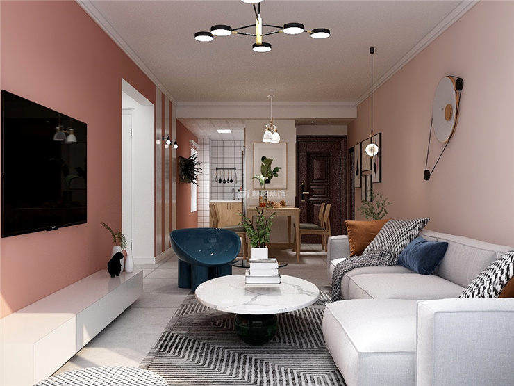 客厅的沙发为白色,与墙面的粉色相结合展现出室内的温馨与舒适,灰色地毯为配色,三种颜色相结合不但显的协调还不会发生颜色碰撞。
