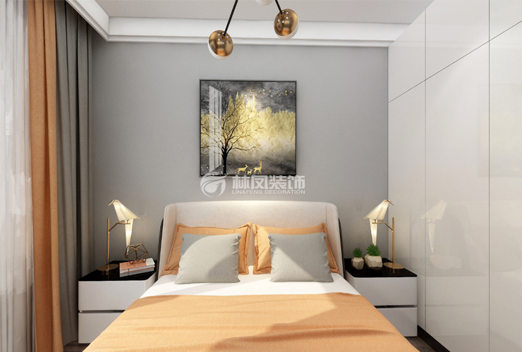 主卧室主要以白色为主,与灰色的窗帘搭配在一起,少量的橘色点缀,整个空间给人以十分舒适的感觉。次卧室榻榻米房,点缀灰色窗帘,白色的衣柜,简单干净。客卧室使用橘色相对较多,给人清新明快的感觉。