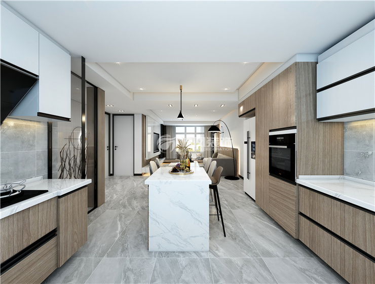 厨房采用开放式厨房,橱柜采用平板门无拉手,更现代美观感觉.,采用原木色和白色的配色进行搭配.更好打理.