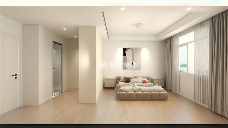 柜体以米色为主,形成独立衣帽间,使整个卧室空间分区更明确。