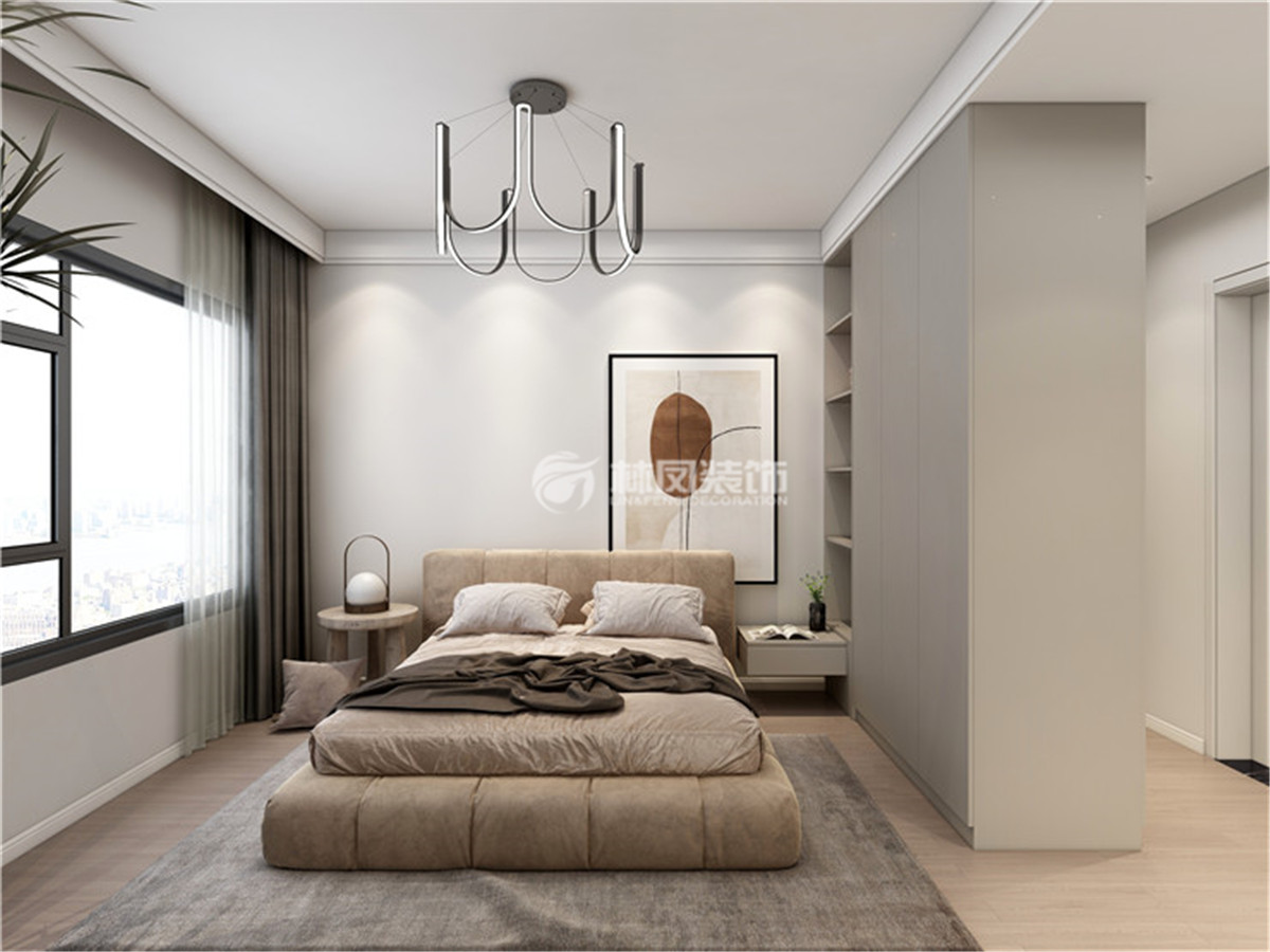 主卧室说明;主卧室应该回归生活的本质,最主要的功能是休息,其次是收纳。暖色地板的铺设,舒服又大气。主卧有开放式衣帽间,收纳空间也可以做到最大。床头上方挂一副画,让屋内不再单调。