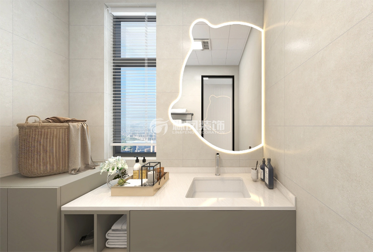 卫生间说明:卫生间空间大,打造超长大台面,配灰色系墙砖使整个空间大气宽敞明亮。干湿分离的设计使整体的使用更加舒服。
