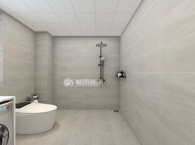 卫生间说明:卫生间空间大,打造超长大台面,配灰色系墙砖使整个空间大气宽敞明亮。干湿分离的设计使整体的使用更加舒服。