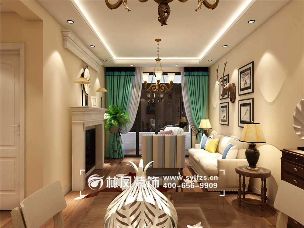 原木灰色地板,配上墙面的米黄色的颜色,颜色跳跃的窗帘,加以白色沙发的融合,整个一个简约美式的氛围,电视背景采用的是壁炉式设计,让整个简约美式的设计看着不那么简约。